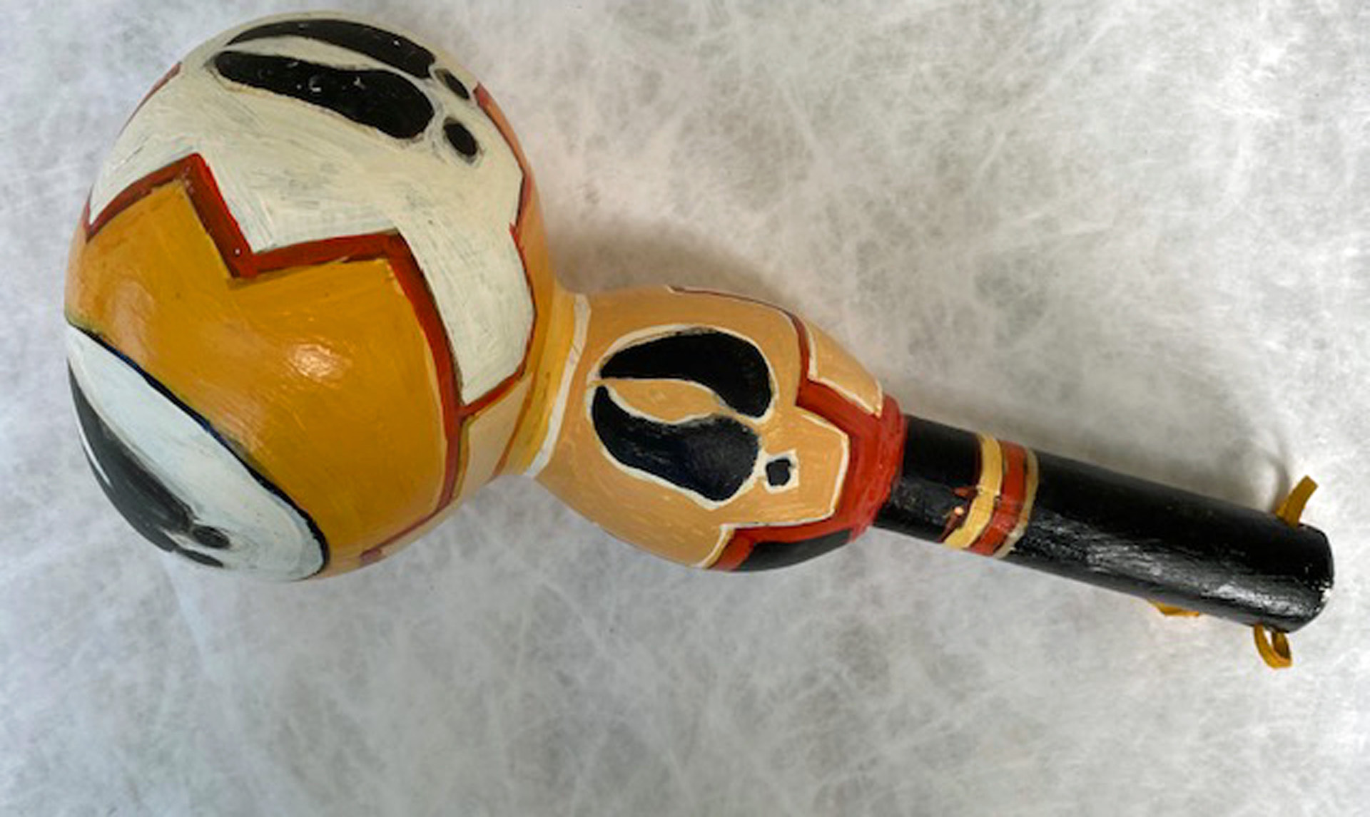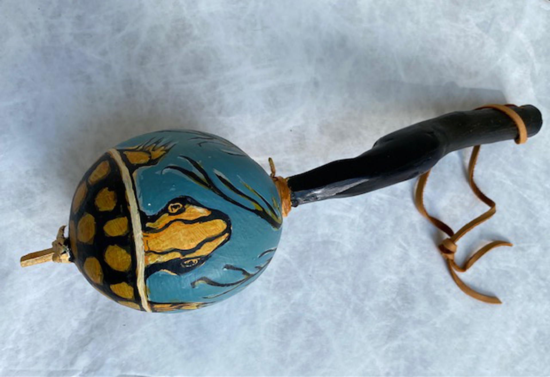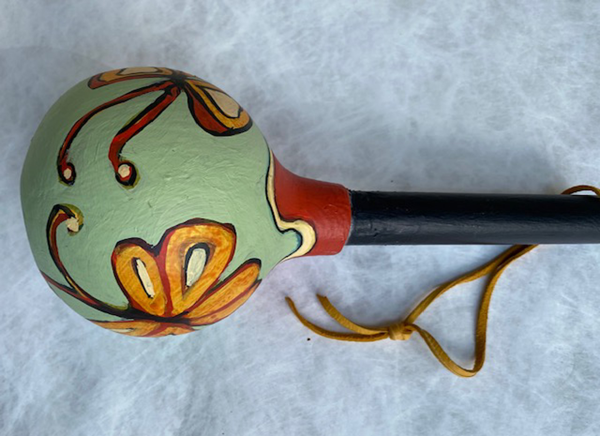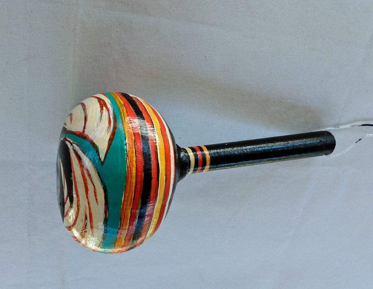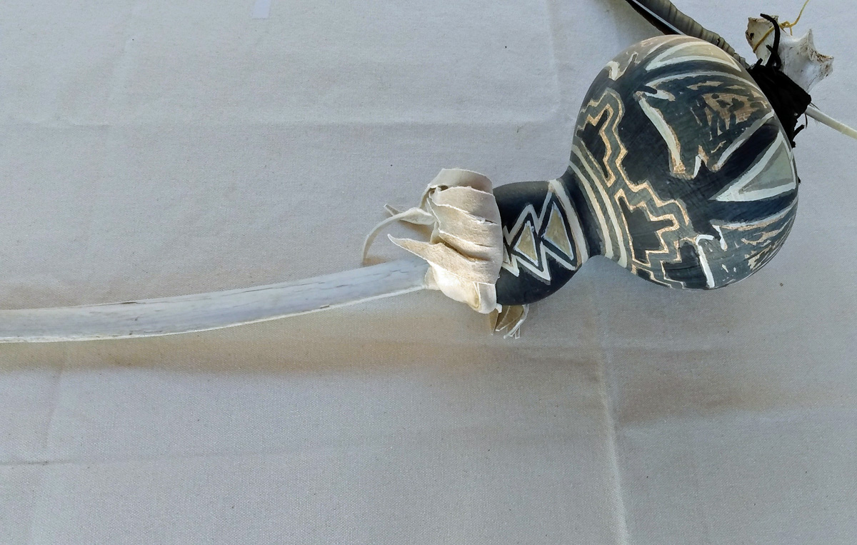Several years ago, I started my own gourd gardens, planting the seeds, harvesting the gourds and making them into rattles. I clean and prepare them — removing the seeds, bleaching the exterior to remove any mold, painting a gesso primer on the surface and inserting a dowel handle (or sometimes a buffalo bone or interesting stick). My wife and I create designs on the gourd’s surface and she finishes them with acrylic paint and varnish.