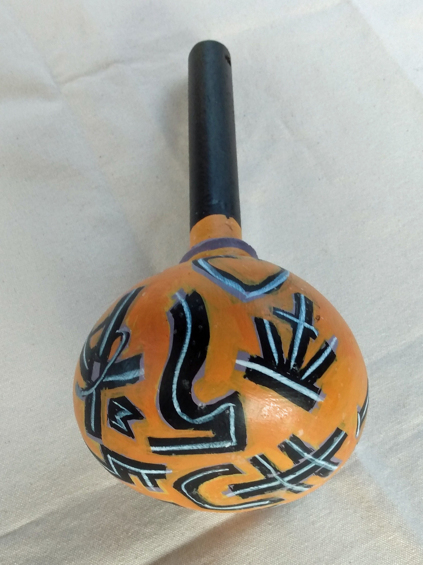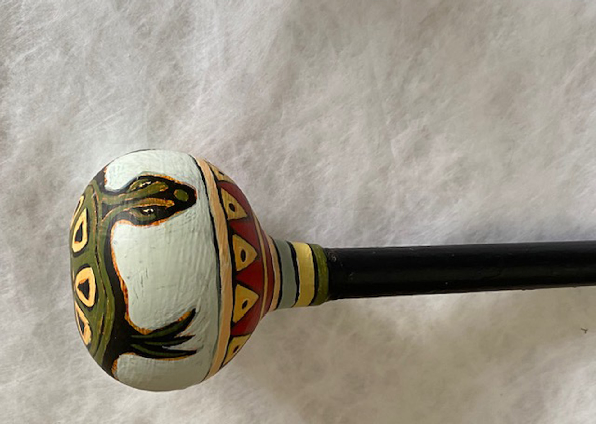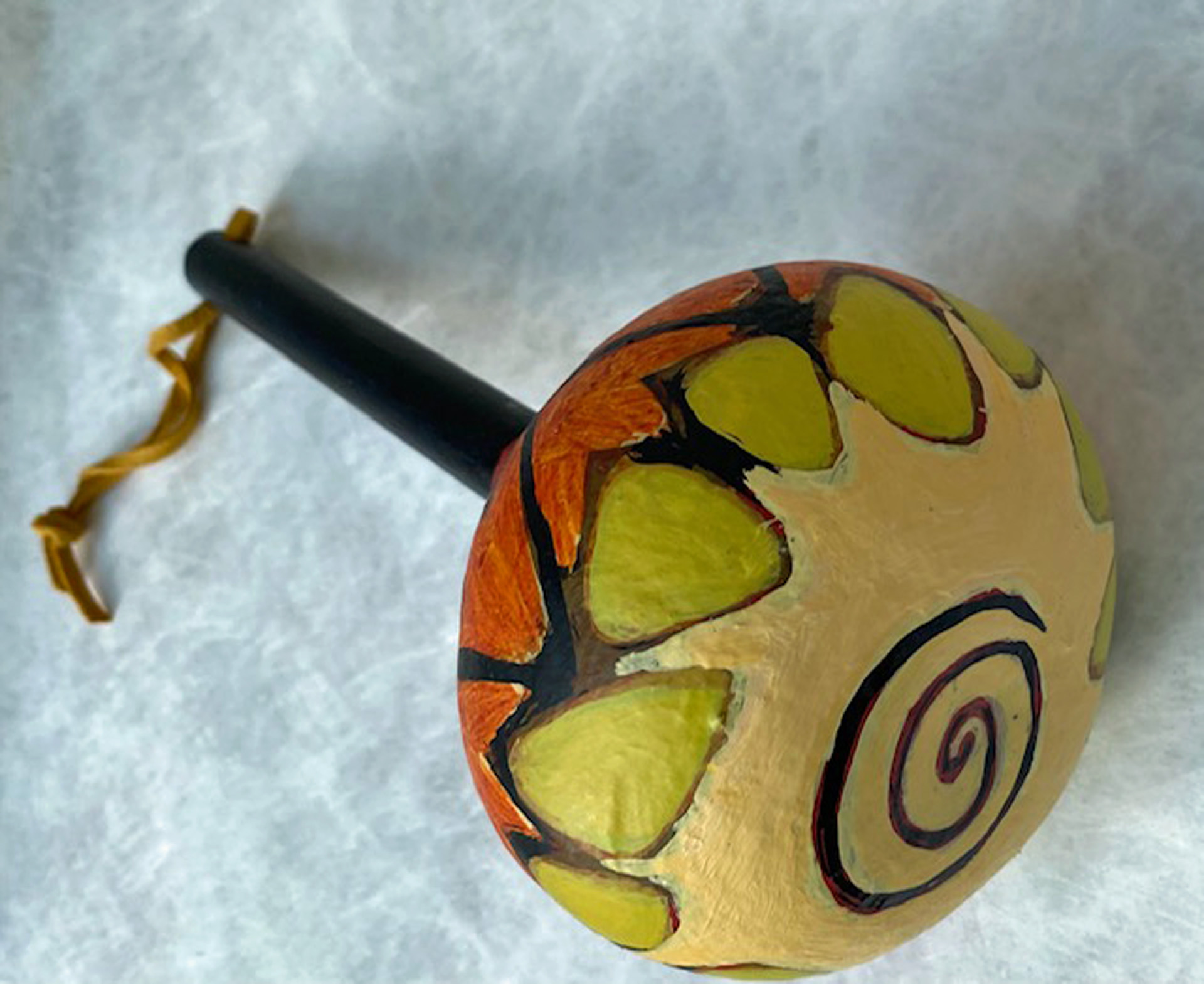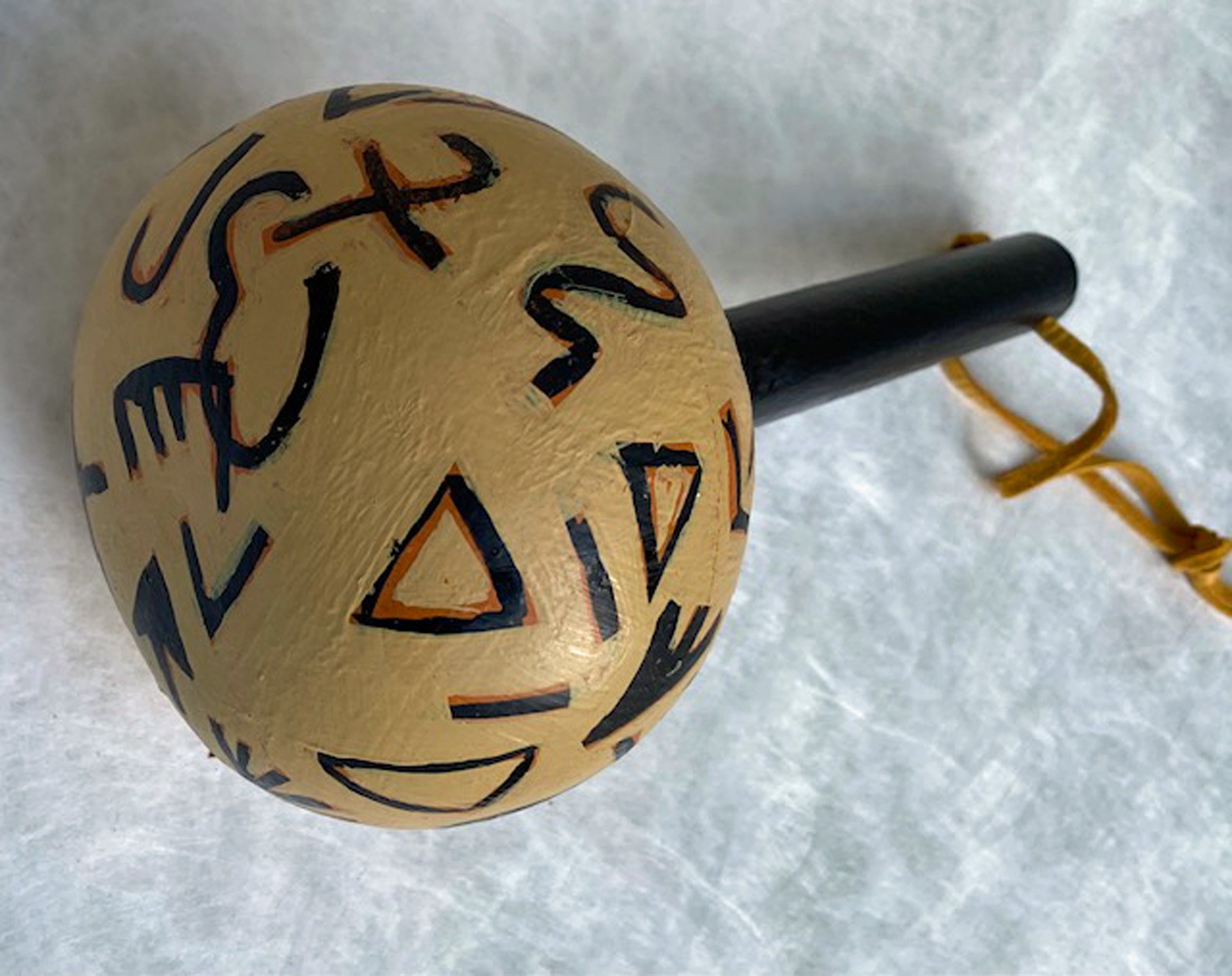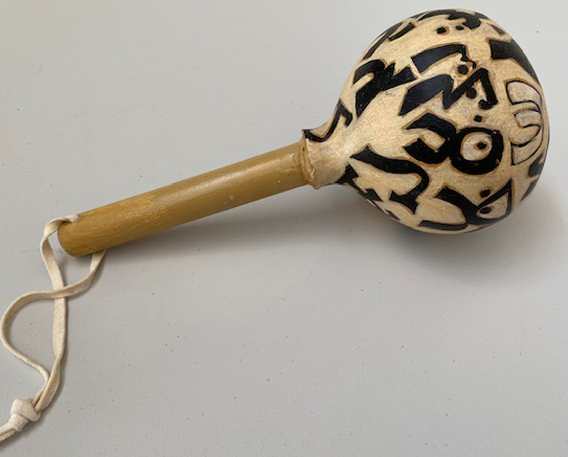 Several years ago, I started my own gourd gardens, planting the seeds, harvesting the gourds and making them into rattles. I clean and prepare them — removing the seeds, bleaching the exterior to remove any mold, painting a gesso primer on the surface and inserting a dowel handle (or sometimes a buffalo bone or interesting stick). My wife and I create designs on the gourd’s surface and she finishes them with acrylic paint and varnish.