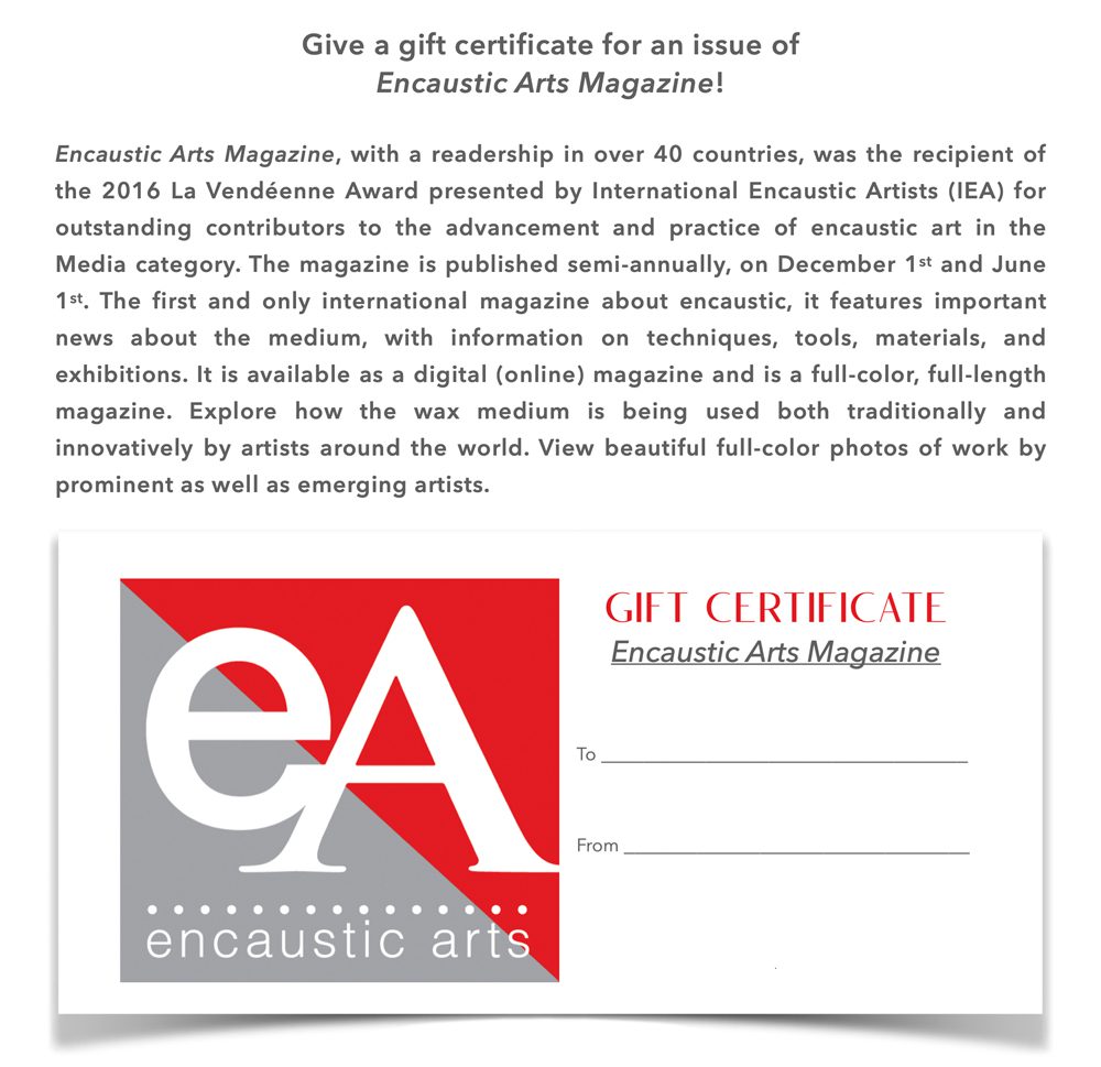 To give a gift certificate for the digital (online) current issue or one of our back issues: Click the Add to Cart button below. The shopping cart will open just below. Click the yellow checkout with PayPal button to complete your payment. Then email us, with your name, the recipient’s name, and email address, and we will send you the gift certificate which you can print out and give to the recipient or email to the recipient. Or send a check payable to the Encaustic Art Institute with the above information to Encaustic Art Institute 18 County Rd 55A, Cerrillos, NM 87010.