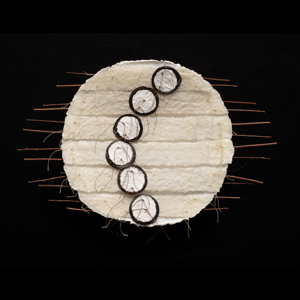 This piece is an exploration of shape and texture within a layered, concave circular form. The overall round shape is repeated in smaller circles placed in an arc across suspended, textured strips of encaustic saturated paper. The design suggests cycles of movement and meditation on spiritual and celestial influences.