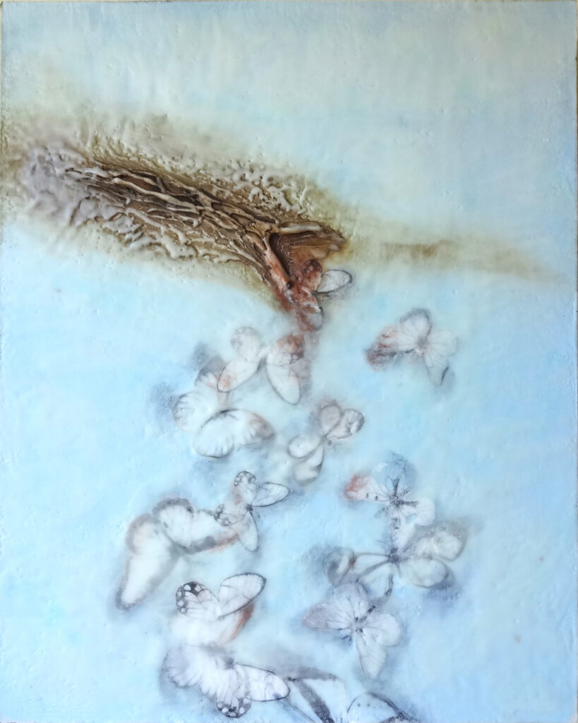 The butterflies are not symbols of transformation in a conventional sense. They are closer to traces — momentary formations that gather and disperse, unable to fully settle into form.
