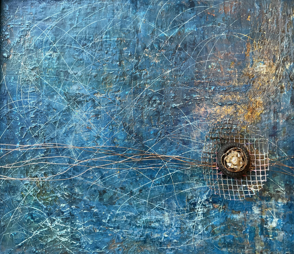 The painting began with raw words written into the first layers: Lifeforce. Fierce. Warrior. Fight. Win. They helped me channel the tangle of pain, rage, and stubborn hope that rises when someone you love is facing the unthinkable. Copper threads through the piece for its warmth and its long‑held associations with healing. Seven copper wires cross the surface like pathways or conduits. A lucky penny is tucked beneath the wire form. Even as a medical professional, I believe in small talismans. Medicine needs luck too. Life does.