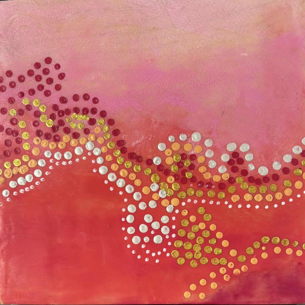 It amazes me that even after many years of working with encaustic, I am continually surprised by the process and outcome. This piece began using encaustic oil sticks, blending the colors to find the right way light was captured. I saw designs on the board that needed to be followed…and I kept going. It became a study in meditation as I continued to work on the series. Where was the path taking me? Where could it be taking you?