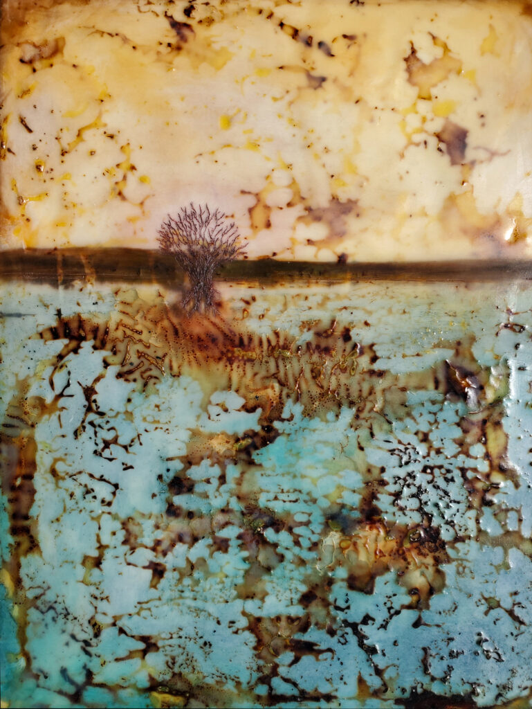 What began with an early morning photo of a barren tree standing alone in the marsh grass from the Bosque Del Apache, didn’t imply anything remotely resembling what had happened, it did however encapsulate my feelings of isolation, despair and anger at such hatred, racism and misogyny. The lone tree gave the feelings of disheartenment fuel while the color palette and glue burn emote feelings of the chaos and poisonous cruelty of our country. Still I hold hope that together “Good” will prevail and we will rise.