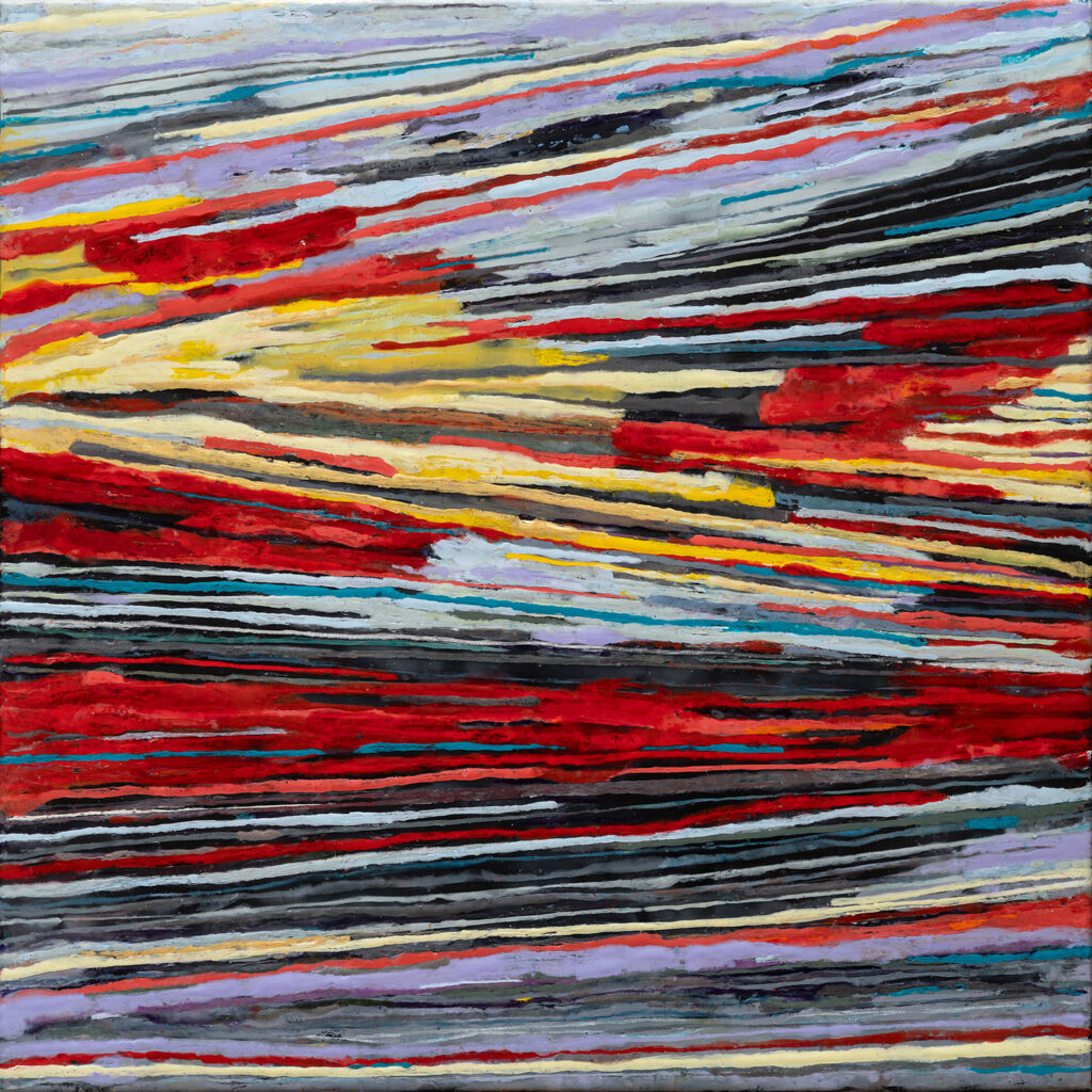 My greatest inspiration, however, came from the distinctive palette of the Grecian sunset—fiery reds and oranges set against deep grays and blacks. In these paintings, I use angular compositions and layered, contrasting color to capture both the movement of the cloud formations and the energy of the light itself.