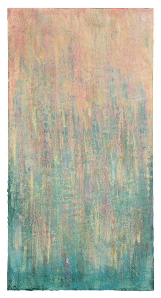 We know that each and every spring the earth will spring back with new life … at least that is my fervent hope and prayer. The upward motion, the springing forth of the colors in this piece, show the realization of Earth promises. The wait is over.