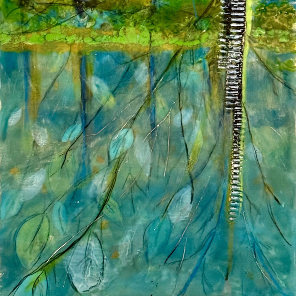 As a gardener and artist, my work is driven by the understanding of nature as a vast, cooperative community, an idea profoundly shaped by the ecological research of Peter Wohlleben and Suzanne Simard. I explore the “Wood Wide Web”—the complex fungal networks and chemical signals that allow forests to function as interdependent systems rather than collections of solitary organisms. In my paintings, trees act as conduits for this exchange; I use deliberate mark-making and incised structures within the wax to render these invisible networks visible. Rather than depicting a literal landscape, I portray vibrant fields of energy flow to emphasize the reciprocity essential to an ecosystem. This work serves as a reminder that we are not separate from the natural world but participants within it, suggesting that our future depends on embracing the same resilience and interdependence found within the forest. This painting brings awareness to the “Mother Tree”, the oldest, largest tree that shares carbon, water, and nutrients to younger seedlings.