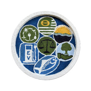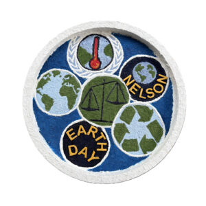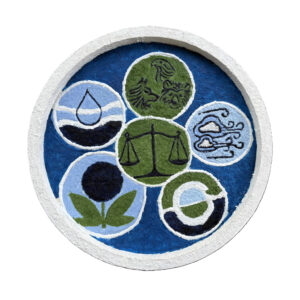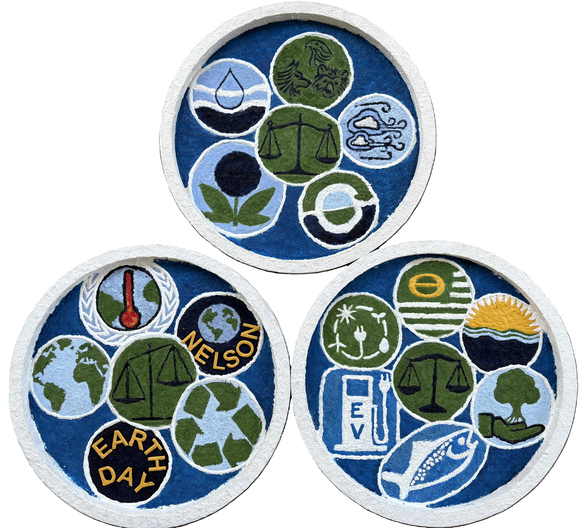 The triptych, Earth Day Legacy, focused on positive images. Senator Nelson’s environmental advocacy should not be celebrated just on Earth Day but remain continuously in everyone’s mind. Our fragile home will not remain habitable unless the world works together to combat global warming. My 16” wooden circles symbolize the earth, our blue-water planet. The Scales of Justice represent ethical decisions, and interior circles represent Federal laws or ecology symbols.