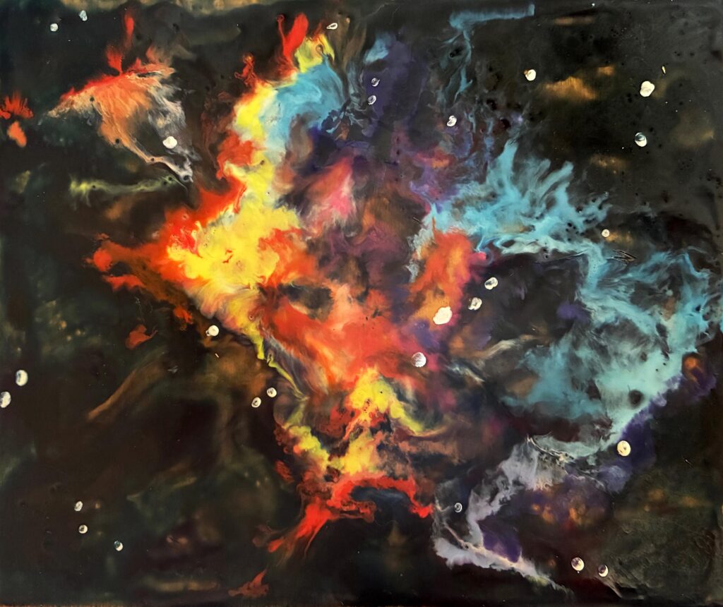 Cosmic Handshake, encaustic on wood, 4-1/8 x 5-1/4 inches