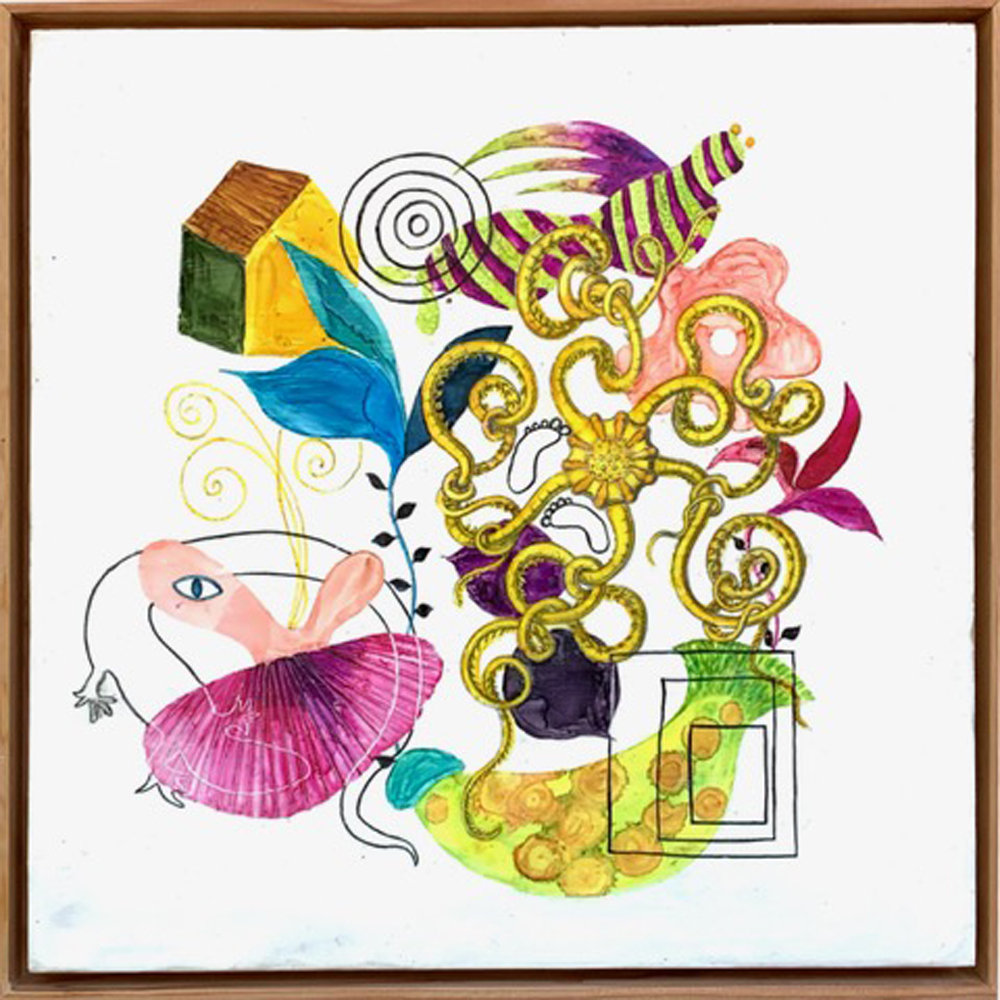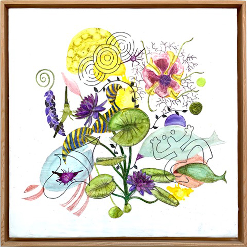 alcohol inks and collage on encaustic on birch panel with floater frame 17 x 17 inches