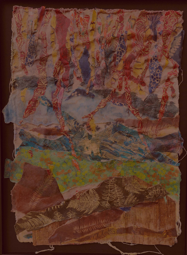 encaustic and collage on raw canvas, approximately 27 x 22 inches