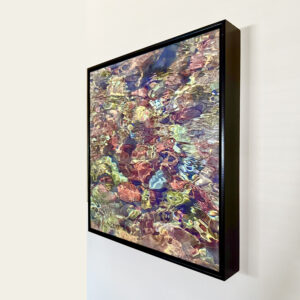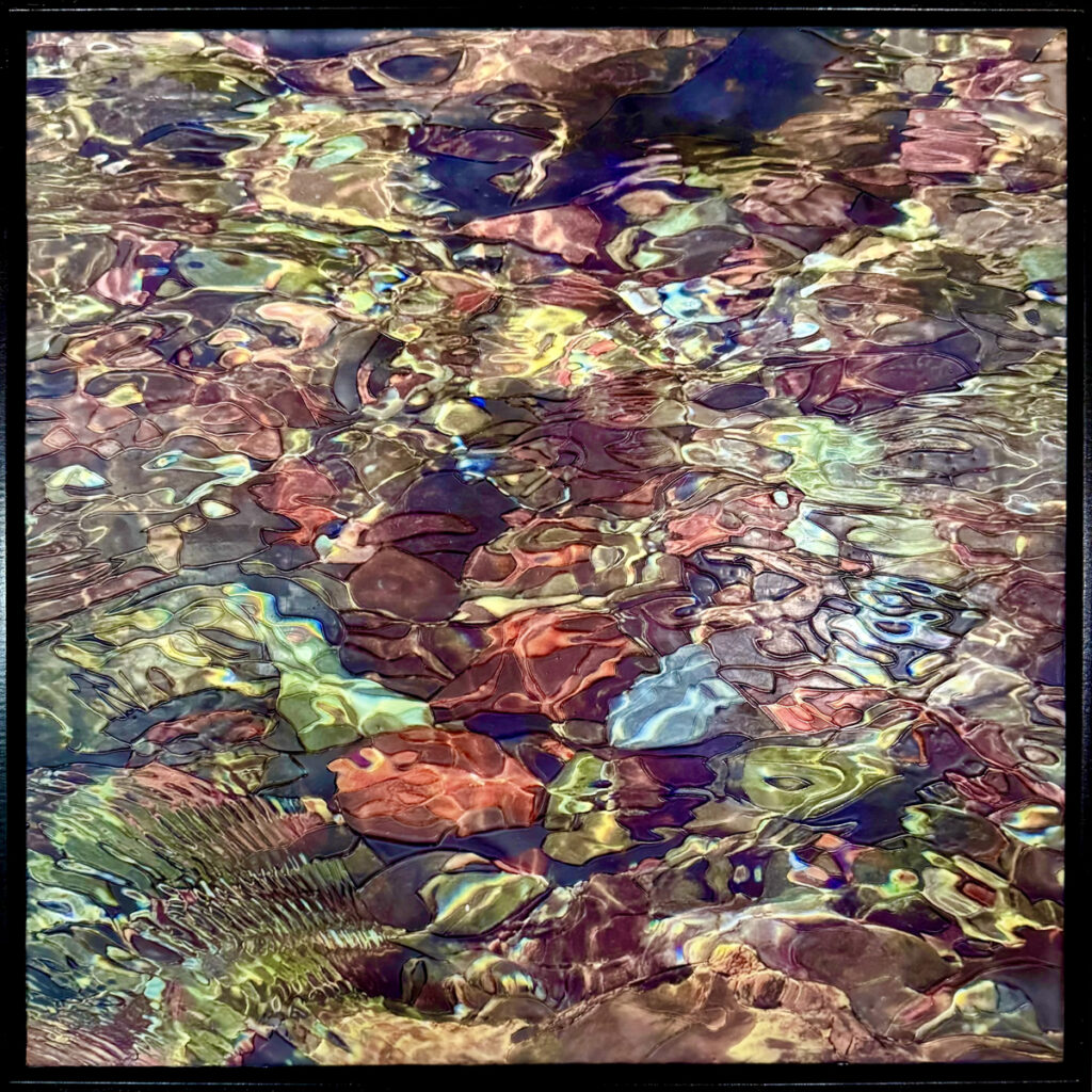 River Stones, Glacier began with a photograph of the colorful river stones in Glacier National Park, Montana. To bring the scene to life, I layered encaustic medium over the image, fusing the wax into the surface. Then, I carved back into each stone, creating texture and depth that makes the rocks feel almost three-dimensional. The result captures not only the beauty of the stones but also the shimmering movement of water as it flows across them.