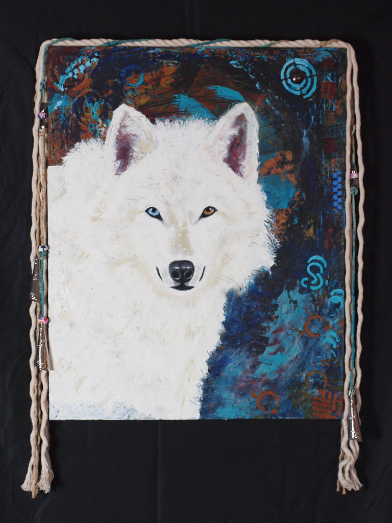 cold wax and oil with rope yarn, beads, metal cones, and star, 20 x 16 x 1 inches (24 x 16 x 1 with yarn length added)