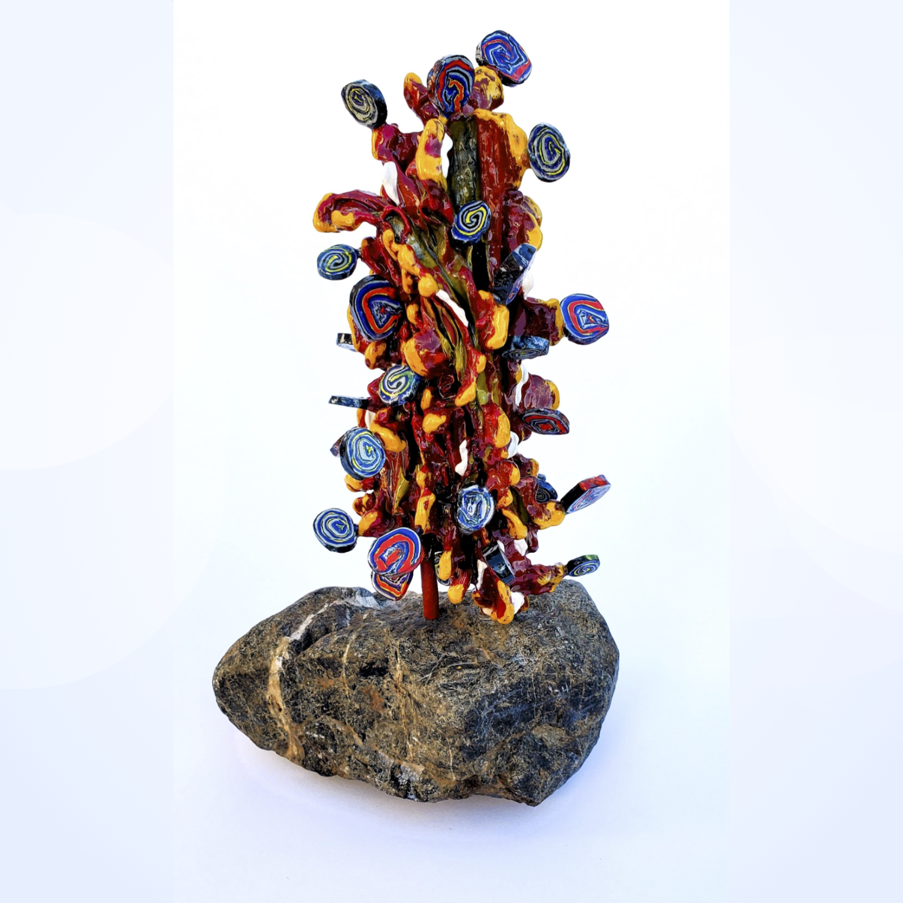 Click on the artist name under the thumbnail images below. When viewing this page on a mobile device, the images are grouped in sets of 4, and below each group of images, are the linked names of the artists in the group. The links connect to a large image on each artist’s page with more details, purchase options, and the artist’s statement on how their work relates to the theme of the climate crisis.