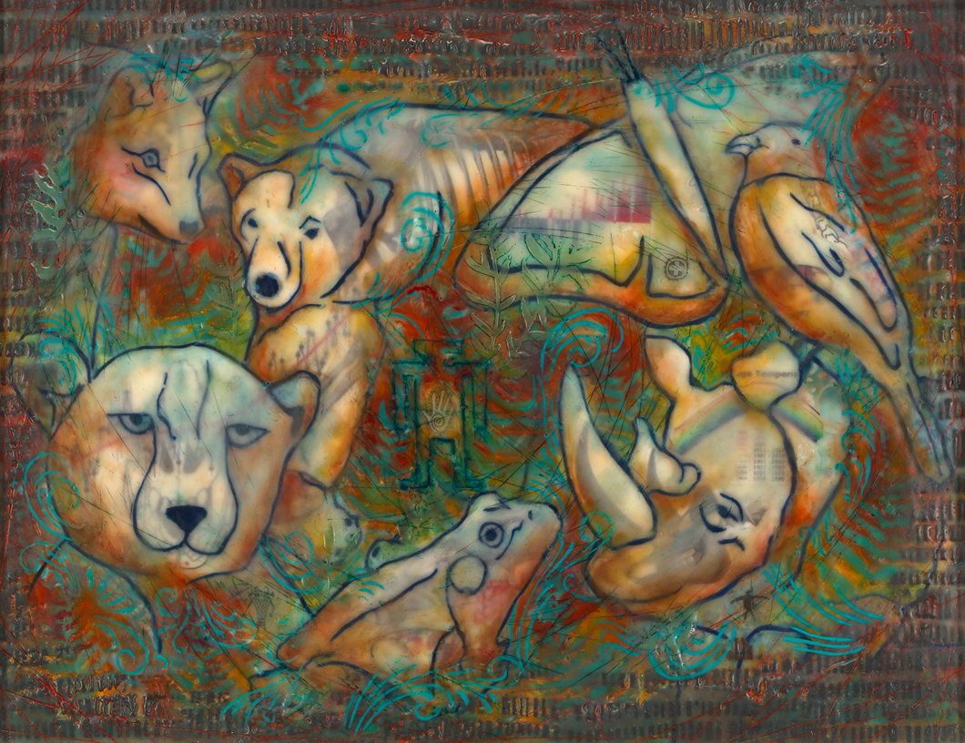 The species depicted in this piece are the Red Wolf, Polar Bear, Monarch Butterfly, White Rhino, Oregon Spotted Frog, and the Amur Leopard. They are a small representation of endangered species due to habitat loss, poaching, invasive species, over exploitation, pollution and CLIMATE CHANGE. In the center is a symbol for Homo Sapien. Homo sapien means wise or knowing human in Latin. When we use our knowing to support conservation efforts and community based initiates we create a world that supports life for all beings. Species such as the bald eagle and the Florida panther have rebounded through conservation efforts. This demonstrates the amazing resilience of nature to recover when given the right support and environmental resources. The Shipibo-Konibo, a tribe in the Peruvian Amazon, have a word for life giving good energy. It is JAKON. May we bring Jakon to all endangered beings through right intention and right action.