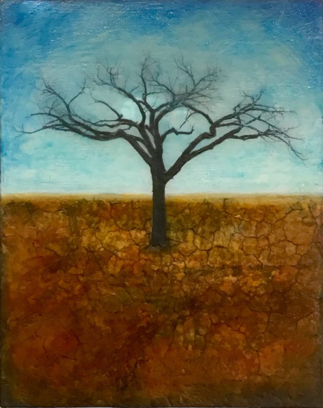 Ain’t No Joke, encaustic, photography, paper, oil pigments, on birch wood panel, 20 x 16 inches