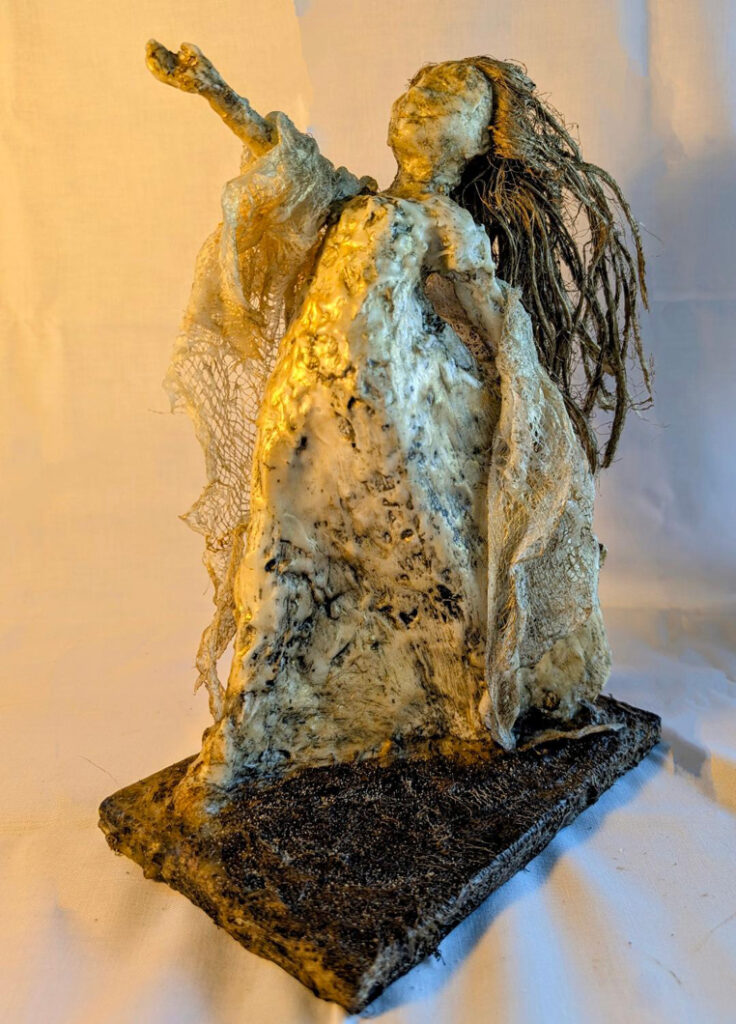 encaustic on repurposed doll, fabric, tar, wood, 12 x 8 x 5 inches