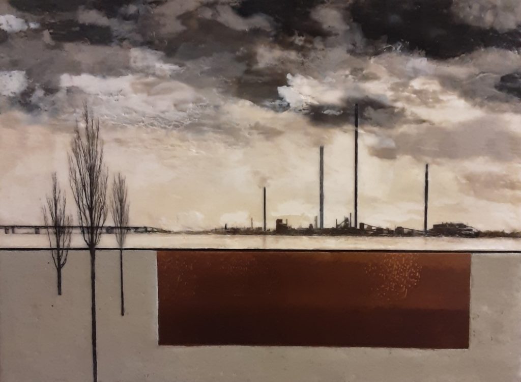 Permanent Collection – Erna de Vries ERNA DE VRIES (CANADA) Carbon Neutral, encaustic, concrete, metal, photo transfer, 16 x 12 inches Click here to return to the Permanent Collection main page.