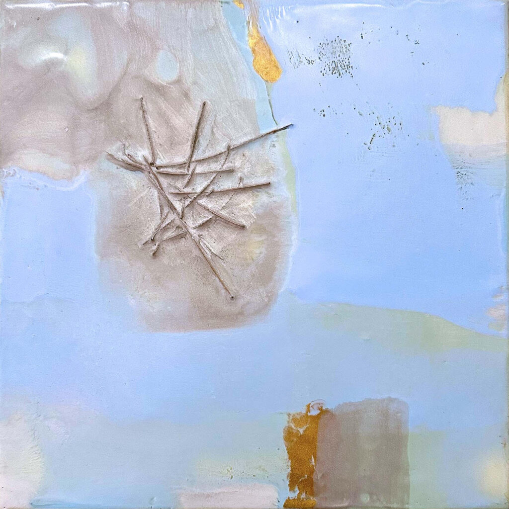 encaustic, jacaranda tree leaf stems, on braced board, 10 x 10 inches