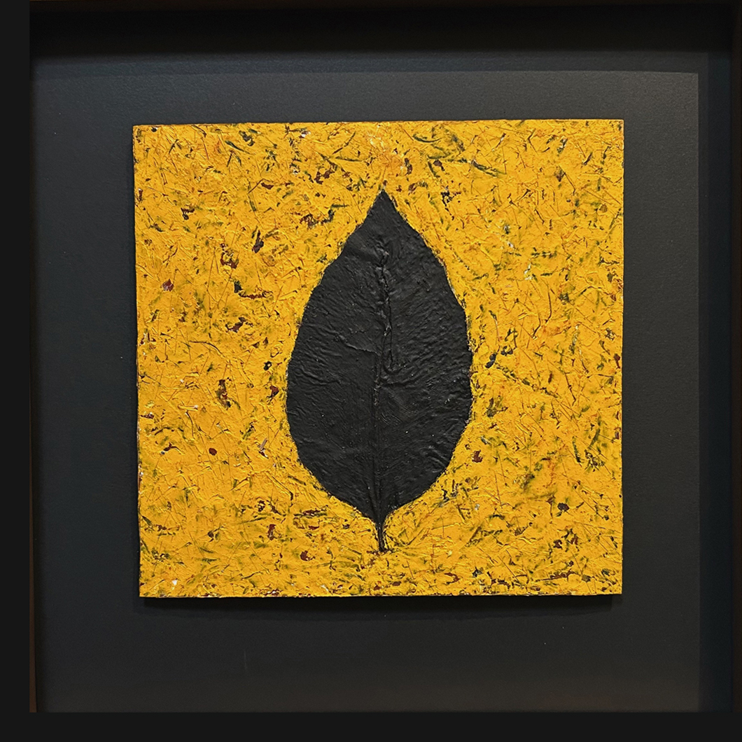 New Delhi winter, 2016. Smog so dense that all fades to a ghostly gray. I’m at this artists retreat to work on a project about water pollution, a continuation of a project I had started in Florida about the degradation of that state’s natural springs. The Yamuna River is one of the world’s most polluted rivers. I am struck by how, in spite of the pollution, the trees survive and seem to thrive on the Sanskriti Kendra campus. I pick the leaves, documenting and then carefully pressing each between the pages of a book. Names like Tree of Sadness and Krishna’s Buttercup stir my imagination. Will the pollution, so prevalent in Third World countries become the fate of the entire world as global warming and its consequences continue to be ignored? In this piece, I juxtapose a pressed East Indian leaf with sunshine yellow: a sign of optimism in spite of growing evidence to the contrary.